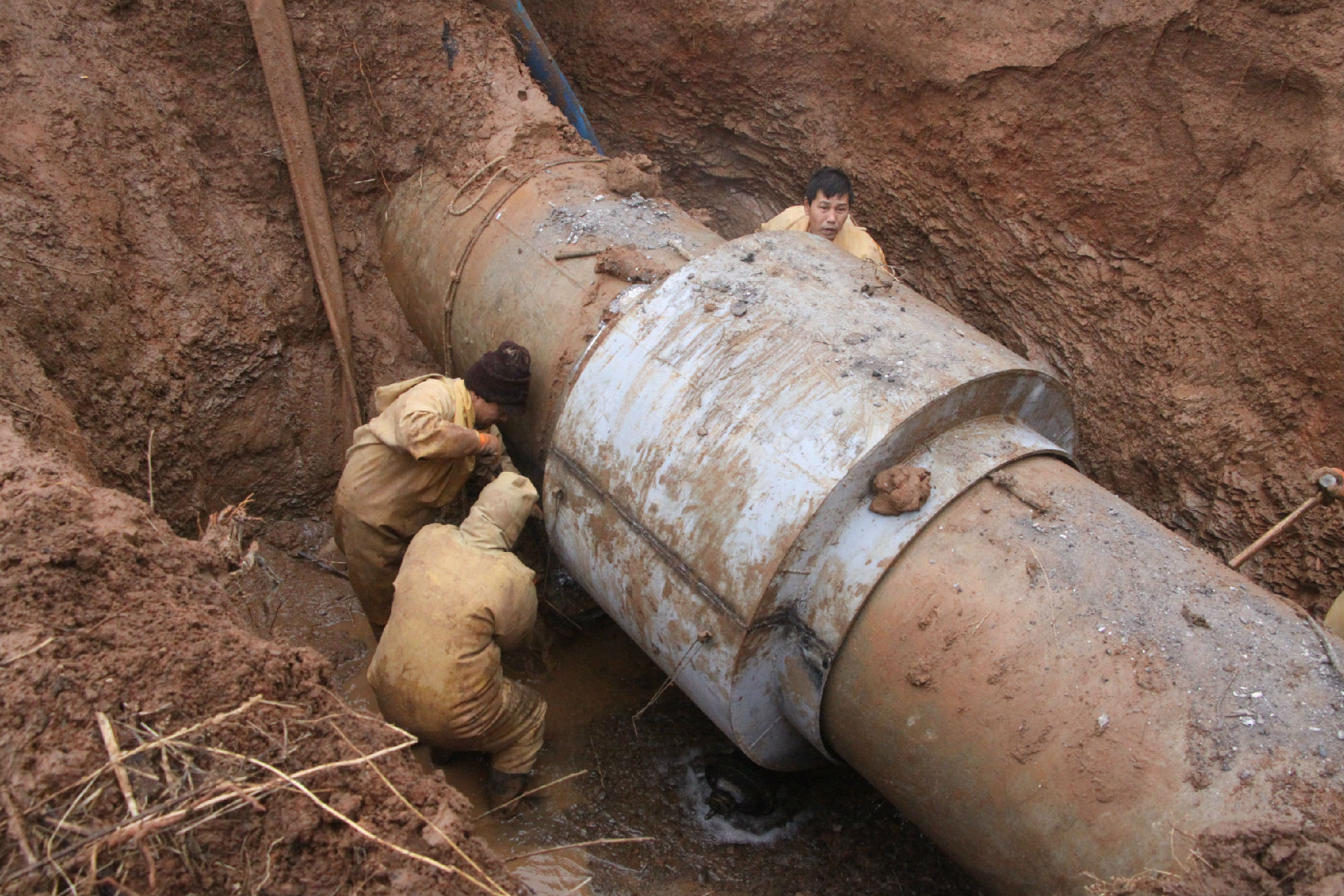 奮力搶修 12月1日早7時(shí),施工人員開(kāi)始搶修作業(yè)。由于天氣寒冷,地面結(jié)冰,給戶(hù)外施工造成很大困難。為爭(zhēng)取搶修時(shí)間,盡快恢復(fù)供水,搶修工程指揮部決定將預(yù)計(jì)15個(gè)小時(shí)的排水時(shí)間縮短到11個(gè)小時(shí),然后一邊排水一邊作業(yè)。在緊張的搶修過(guò)程中,搶修人員分工明確、密切配合?,F(xiàn)場(chǎng)一片泥濘,施工人員輪番下到水坑里作業(yè),穿著單薄的防水服在冰冷的泥水里一站就是幾個(gè)小時(shí),沒(méi)有一個(gè)人叫苦喊累。排水、裝卡子、電焊、灌鉛、打卡子,一道道工序施工,緊張而又有條不紊。搶修是野外作業(yè),沒(méi)有吃熱乎飯的條件,餓了只能以面包和香腸充饑,現(xiàn)場(chǎng)指揮和施工人員始終堅(jiān)守在搶修一線。