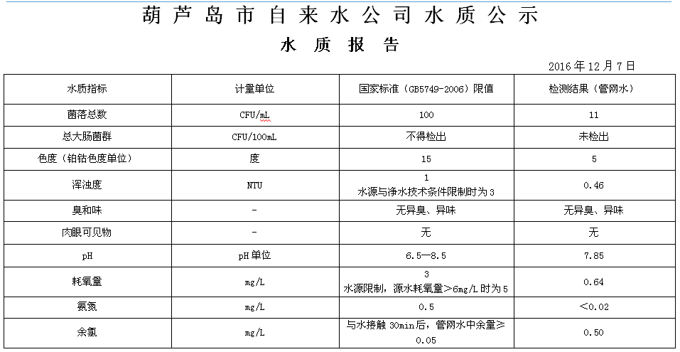 2016年12月第一周 水質(zhì)報(bào)告